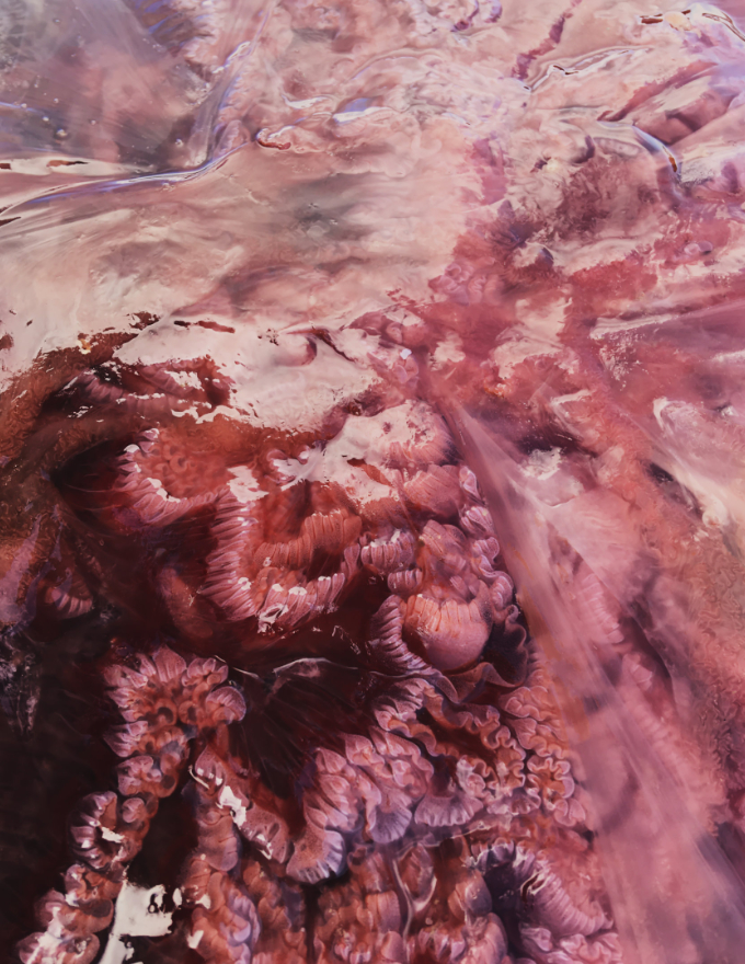 Eine recht klassische Bilderserie organischer Fundstücke des Meeres. In diesem Fall zeigen die Fotografien angespülte gelbe Haarquallen. Als Lebewesen ohne zentrale Nervensysteme reagieren sie ganz unmittelbar auf Reize ihrer Umwelt, von der sie generell nur einige dünne Zellschichten trennen. Trotz dieser augenscheinlichen Einfachheit, stellen Quallen eine der größten Konstanten der irdischen Besiedlungsgeschichte dar. Die Fotografien dokumentieren ihre sehr komplexe Ästhetik.